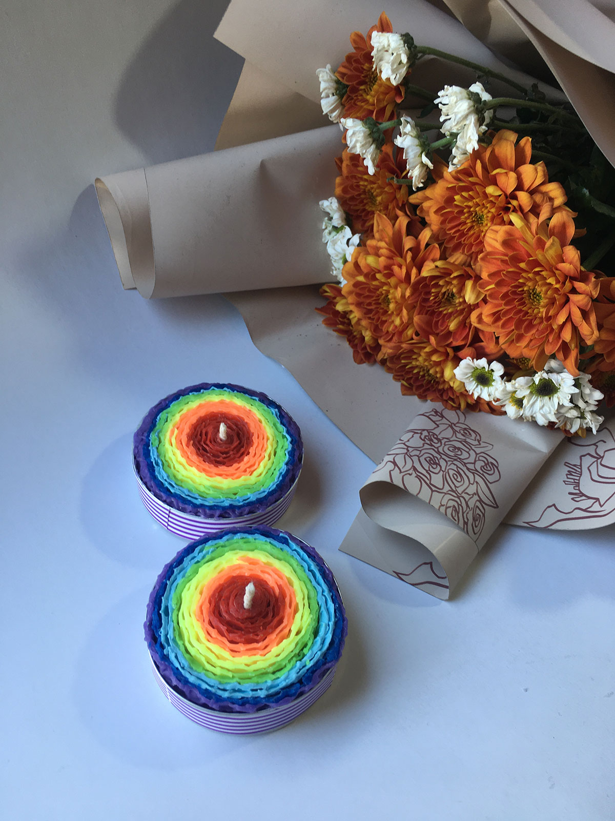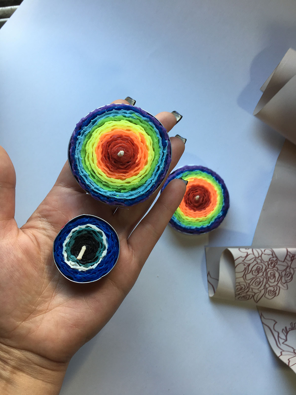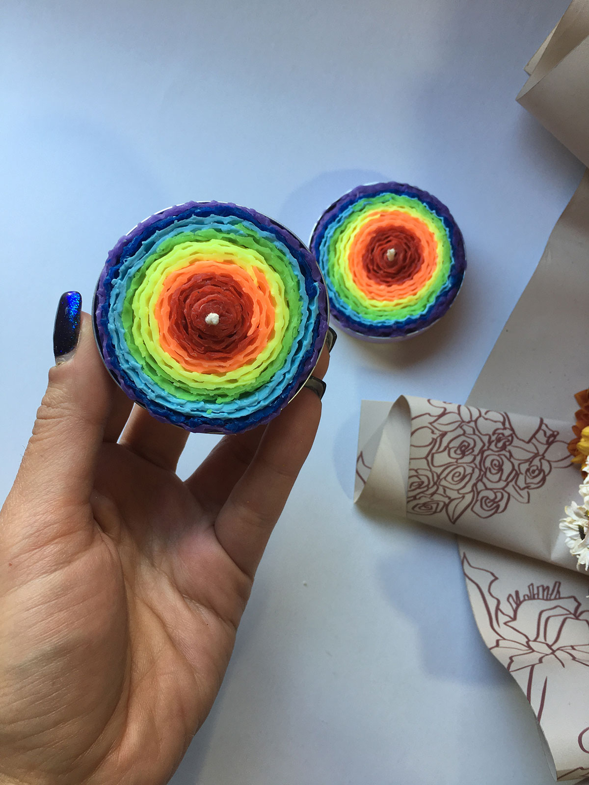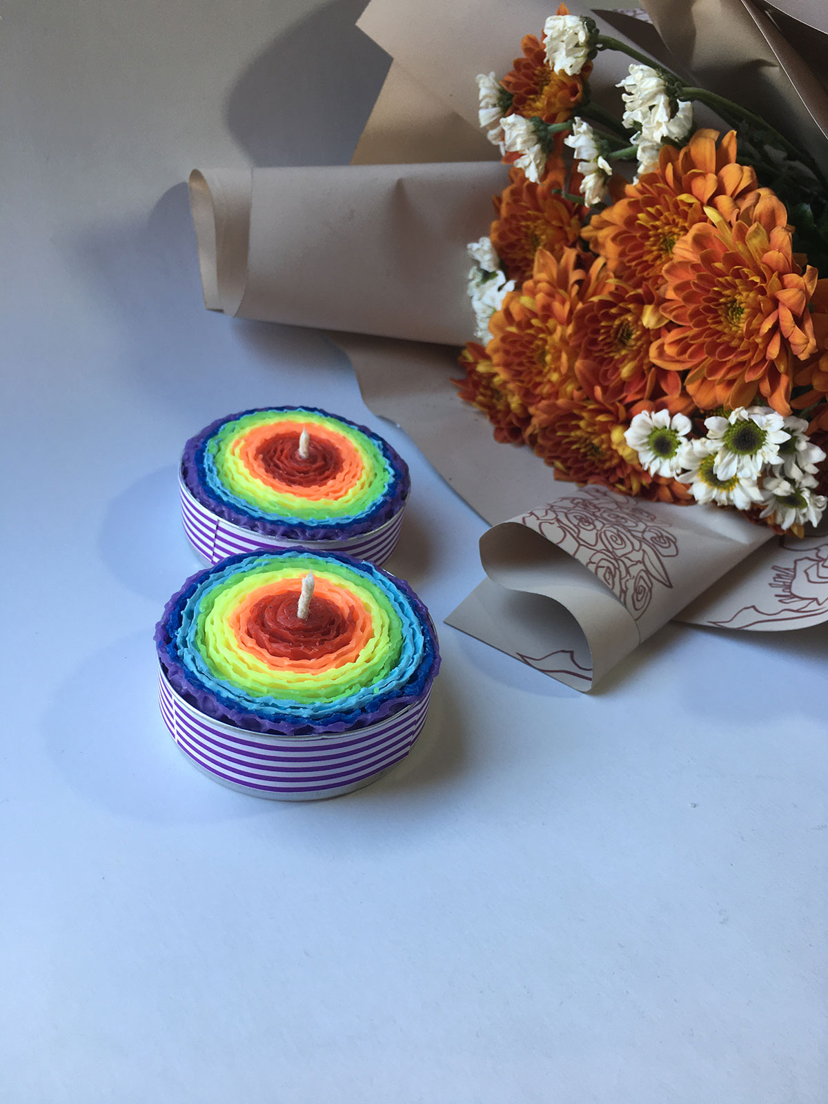 شمع‌های سکه‌ای دست‌ساز از موم طبیعی، قطر ۶ سانتی‌متر، با رنگ‌های هفت چاکرا، نور ملایم و سوخت تمیز؛ مناسب مدیتیشن، انرژی‌درمانی و دکور.